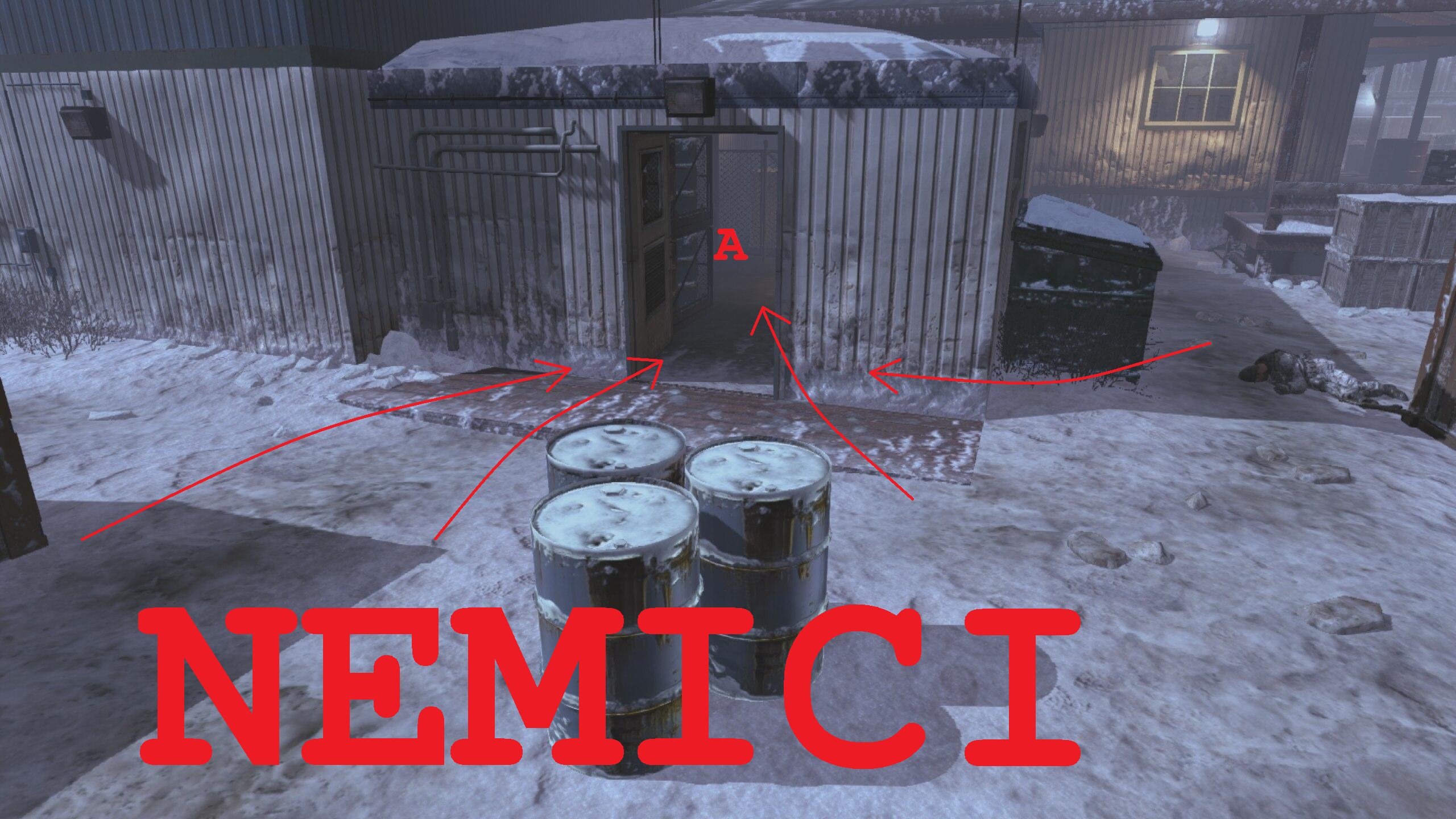Uno alla volta, entreranno e si raggrupperanno nella stanza che vedete nella foto (punto A), che risulta facilmente visibile dall' abitacolo dell' aereo. Quindi, non dovreste avere particolari problemi ad affrontare i nemici "normali", che arriveranno a fiumi proprio da li'. Normalmente, le difficoltà dovrebbero arrivare con i Juggernaut e con gli elicotteri nemici, giusto? Non stavolta: Infatti restando li' sopra i Juggernaut non riusciranno a vedervi e rimarranno bloccati nei pressi dell' aereo, imbambolati: credetemi, scaricare caricatori addosso a un juggernaut paralizzato e rincoglionito come uno zombie è una goduria. I problemi possono arrivare con gli elicotteri: infatti per la maggiorparte delle volte non riusciranno a colpirvi ma c è un punto dell' hangar che ci lascia scoperti ad un loro attacco, ed è la zona mostrata nella terza foto.