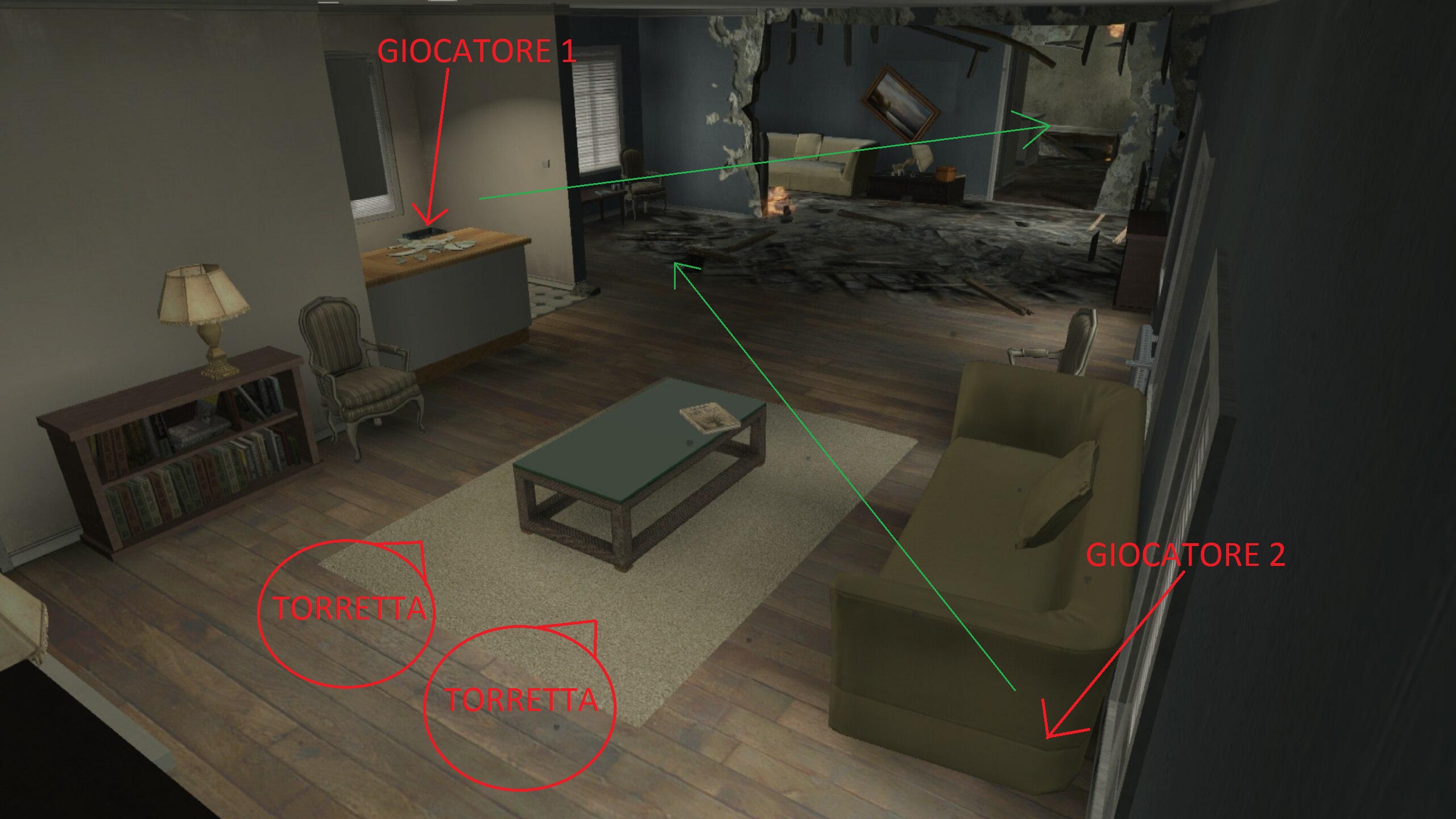 Quindi il giocatore 1 rimane nascosto dietro al muro della cucina e controlla la porta che dà sul soggiorno, mentre il giocatore 2, dietro al divano, sorveglia l ingresso della cucina. Questa zona è particolarmente vantaggiosa poichè ci fornisce una buona copertura e lascia i nemici esposti (infatti spesso rimangono bloccati in zone facilmente visibili senza che riescano a rispondere al fuoco). Quando le ondate si faranno piu toste è buona cosa posizionare due Torrette Robot (NO LANCIAGRANATE) davanti al camino, che aiutano non poco a bloccare i nemici che cercheranno (invano) di entrare nella stanza. I pochi nemici che entreranno spesso e volentieri non avranno il tempo di rispondere al fuoco, mentre tutti gli altri rimarranno imbambolati nelle zone 1, 2 e 3 come si vede in foto.